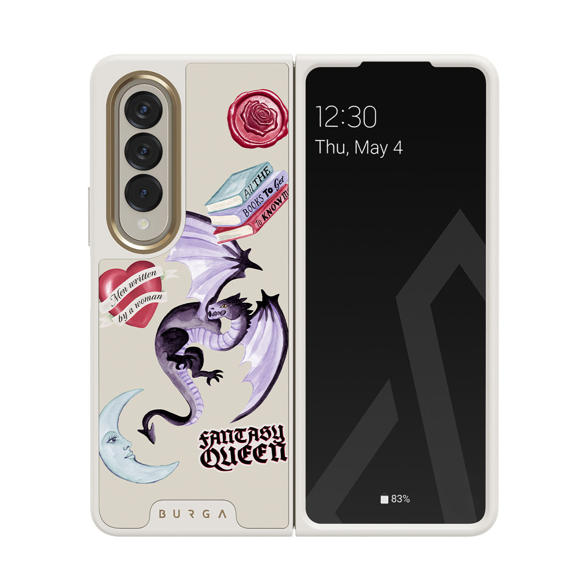 Den här stilen har: lila drake, klistermärke "Fantasy Queen", halvmåne, lila sigill, hjärta med meddelande, böcker.