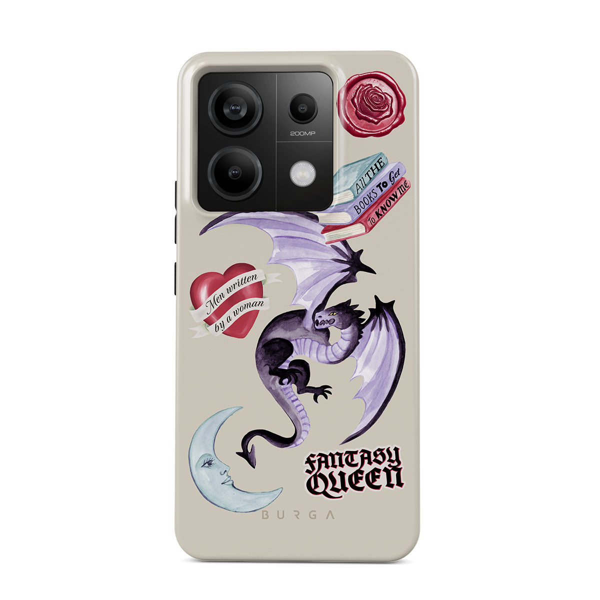 Den här stilen har: lila drake, klistermärke "Fantasy Queen", halvmåne, lila sigill, hjärta med meddelande, böcker.