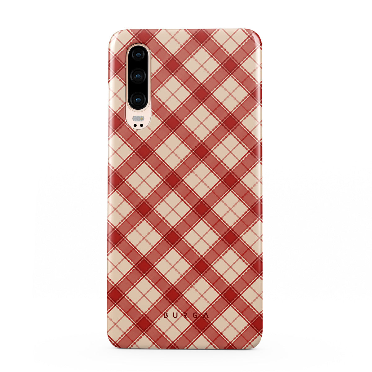 Denna design har: röd och tan plaid, diagonalt plaidmönster, klassisk tartan, buffelrutestil, traditionell julplaid