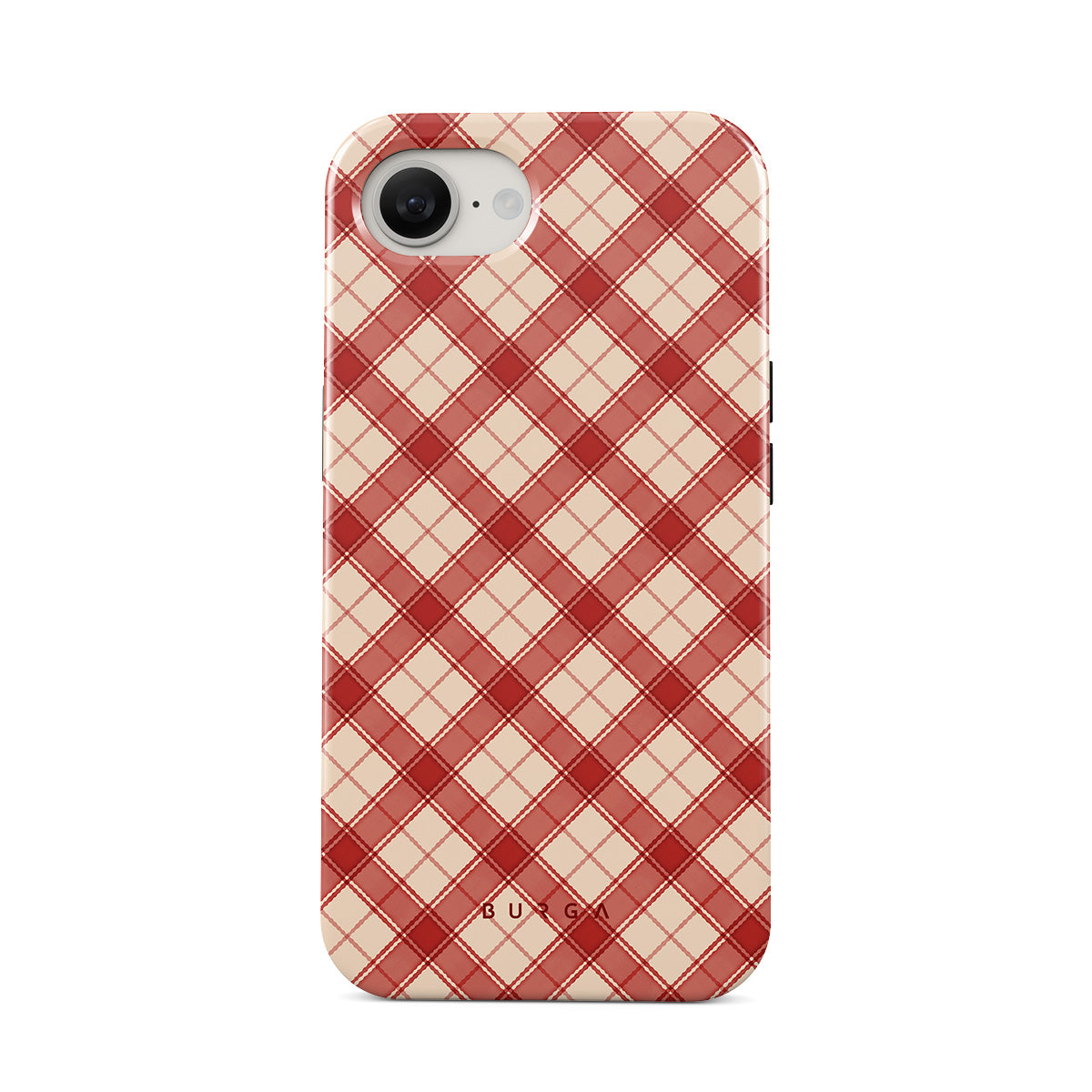 Denna design har: röd och tan plaid, diagonalt plaidmönster, klassisk tartan, buffelrutestil, traditionell julplaid
