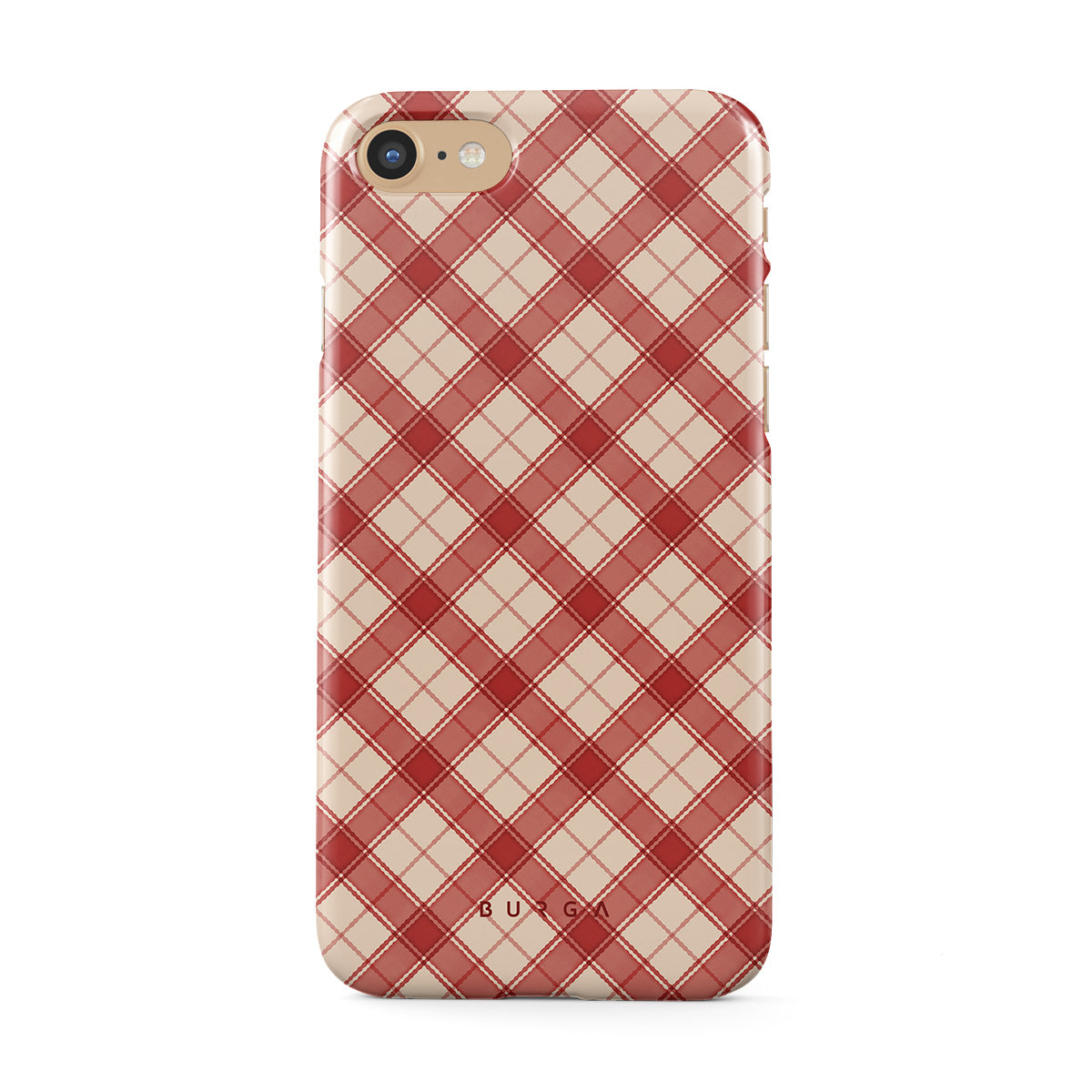 Denna design har: röd och tan plaid, diagonalt plaidmönster, klassisk tartan, buffelrutestil, traditionell julplaid