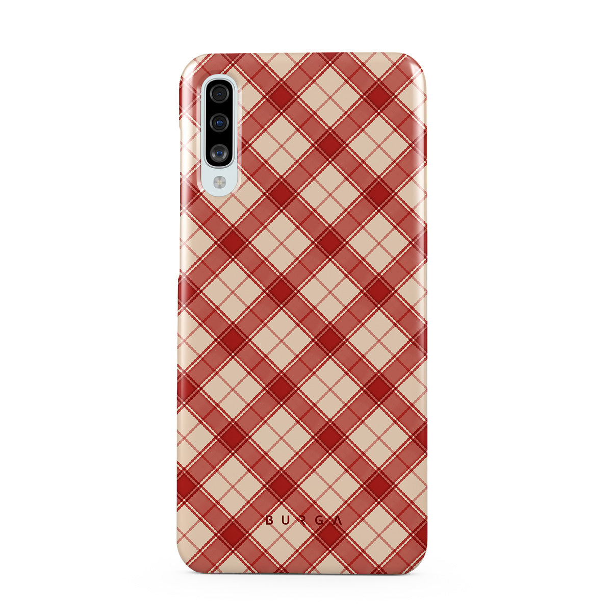 Denna design har: röd och tan plaid, diagonalt plaidmönster, klassisk tartan, buffelrutestil, traditionell julplaid