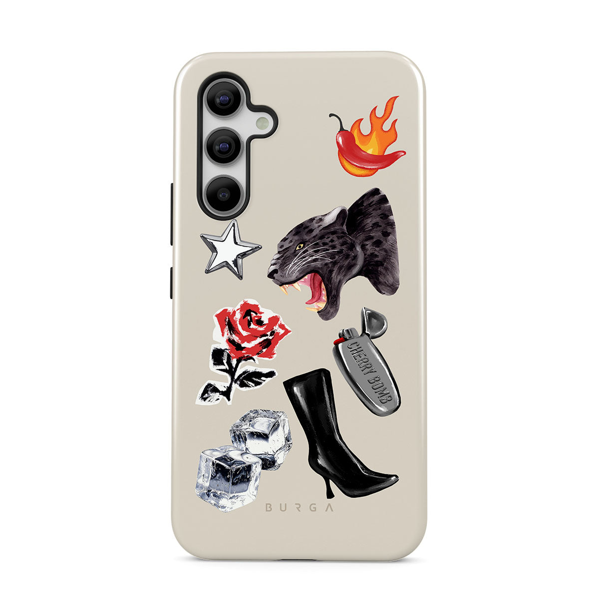 Den här stilen har: svart panter, röd ros, brinnande paprika, silverfärgad tändare, svarta knähöga stövlar, isbitar, silverstjärna.