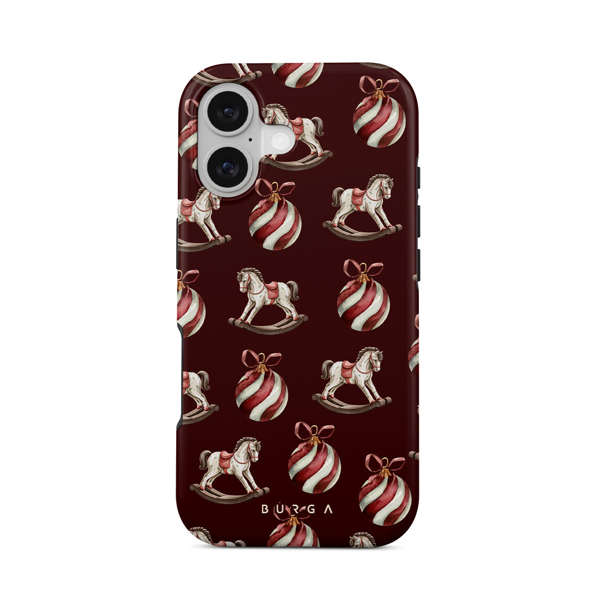 Den här designen har: gunghästar, julgranskulor, röd, julmönster