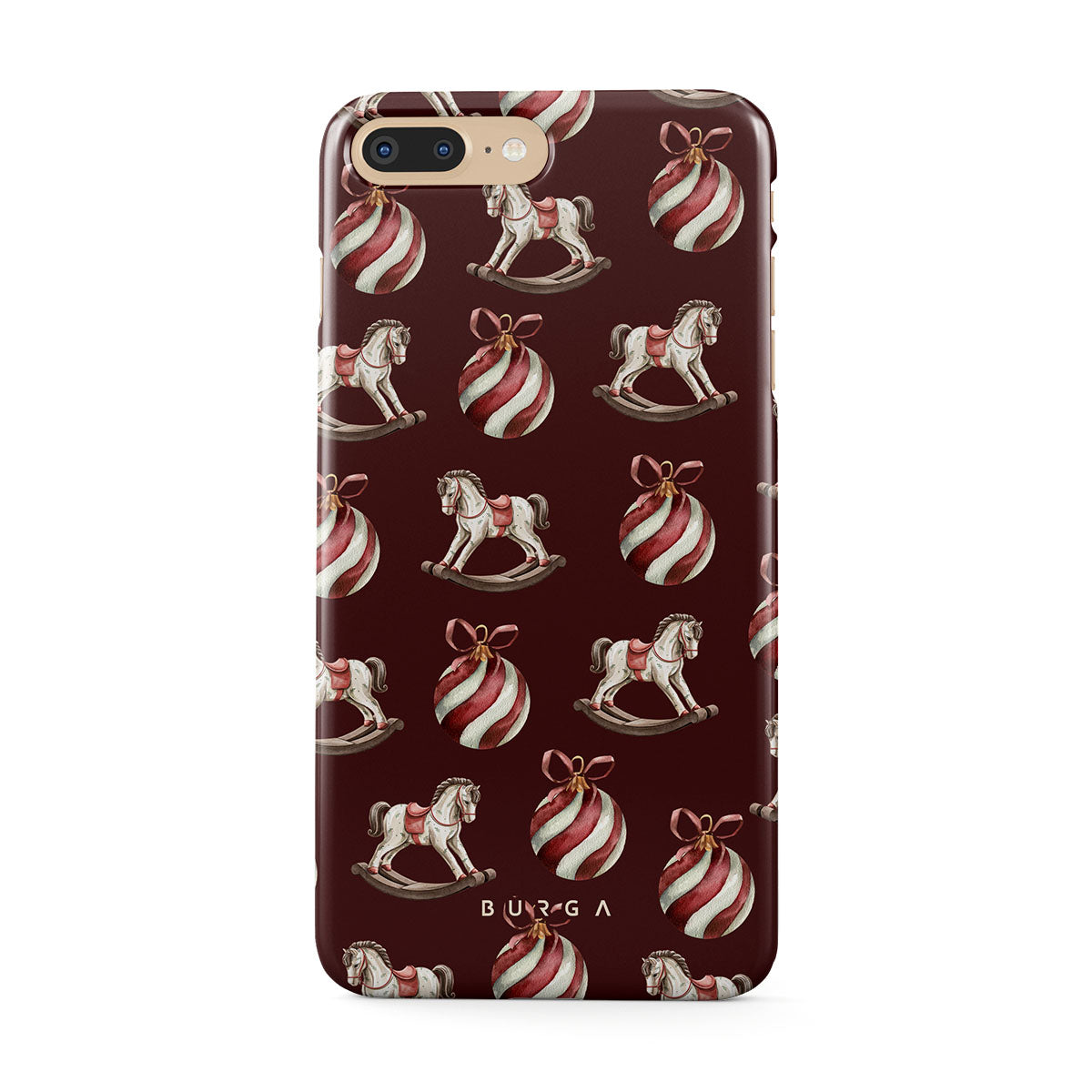 Den här designen har: gunghästar, julgranskulor, röd, julmönster