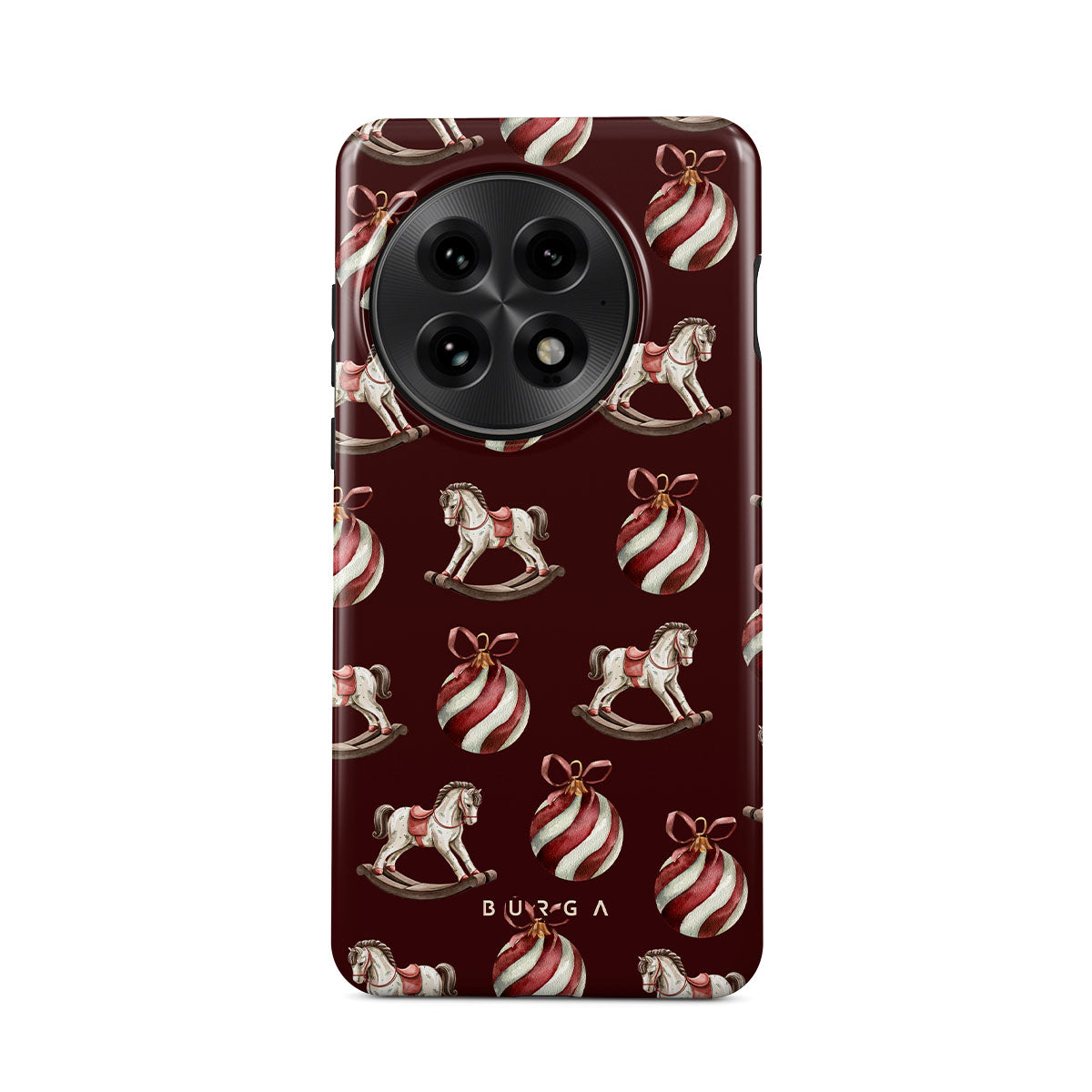 Den här designen har: gunghästar, julgranskulor, röd, julmönster