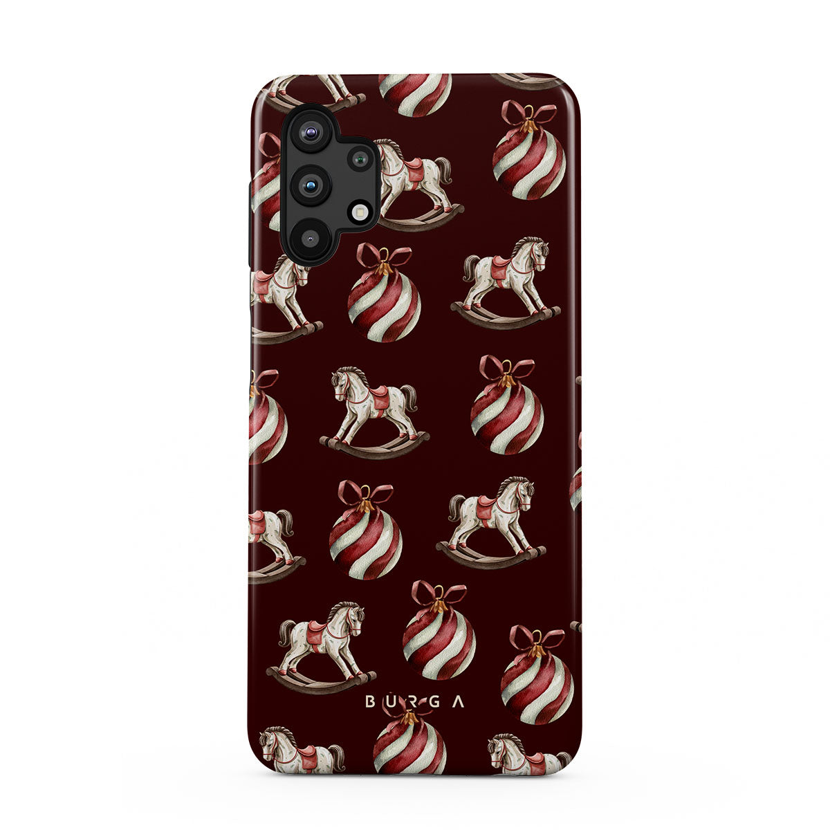 Den här designen har: gunghästar, julgranskulor, röd, julmönster