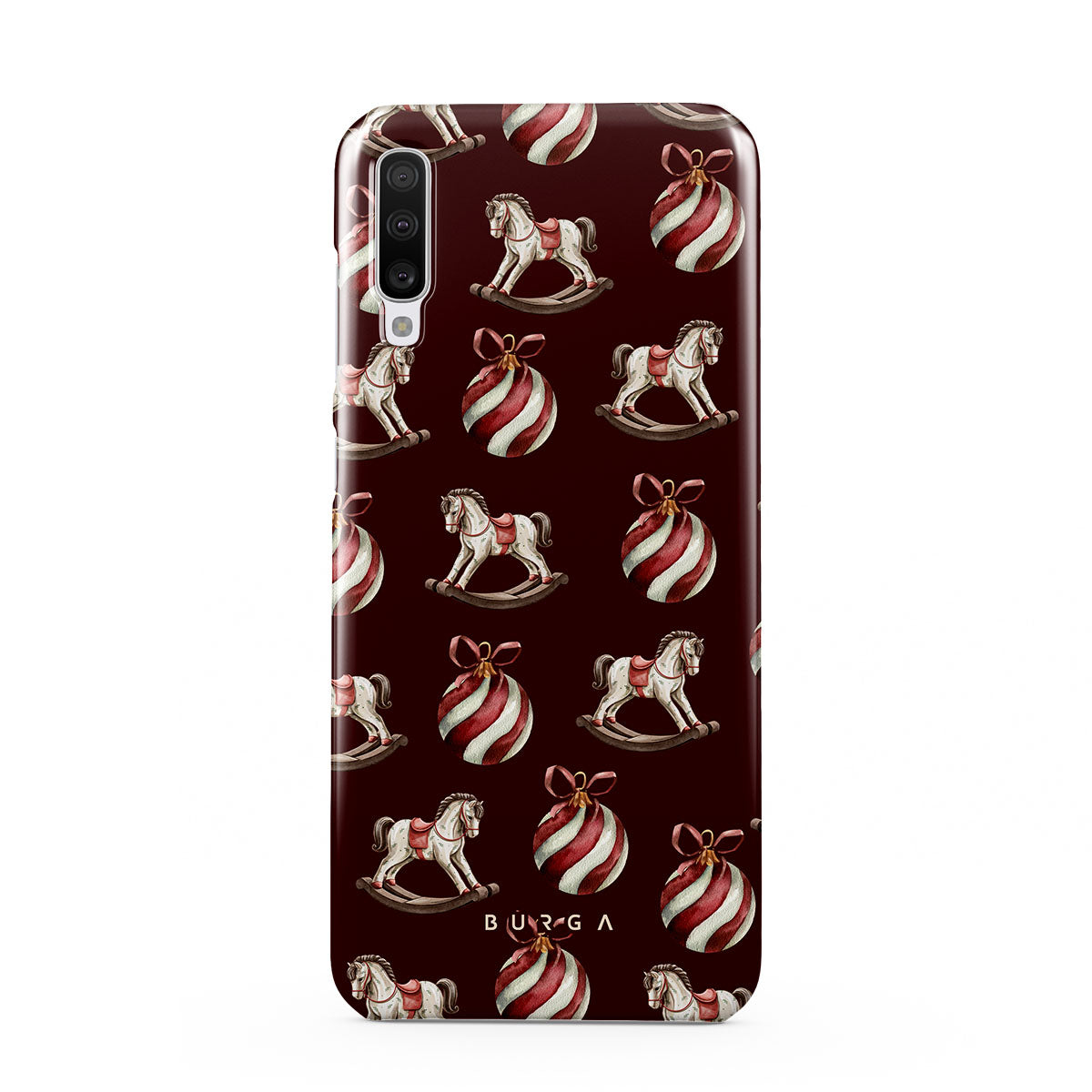 Den här designen har: gunghästar, julgranskulor, röd, julmönster