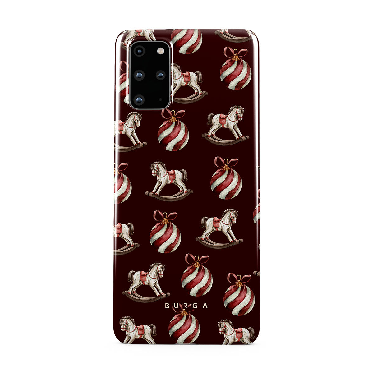 Den här designen har: gunghästar, julgranskulor, röd, julmönster