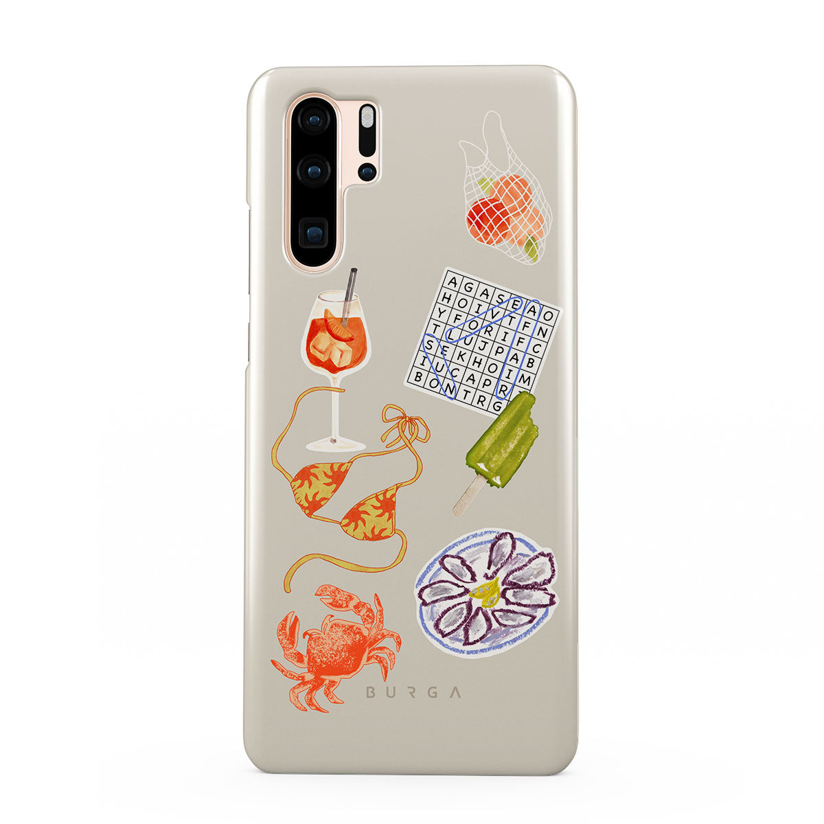 Den här stilen har: krabba, ostronfat, glass, korsord, spritz-cocktail, bikinitopp, frukt.