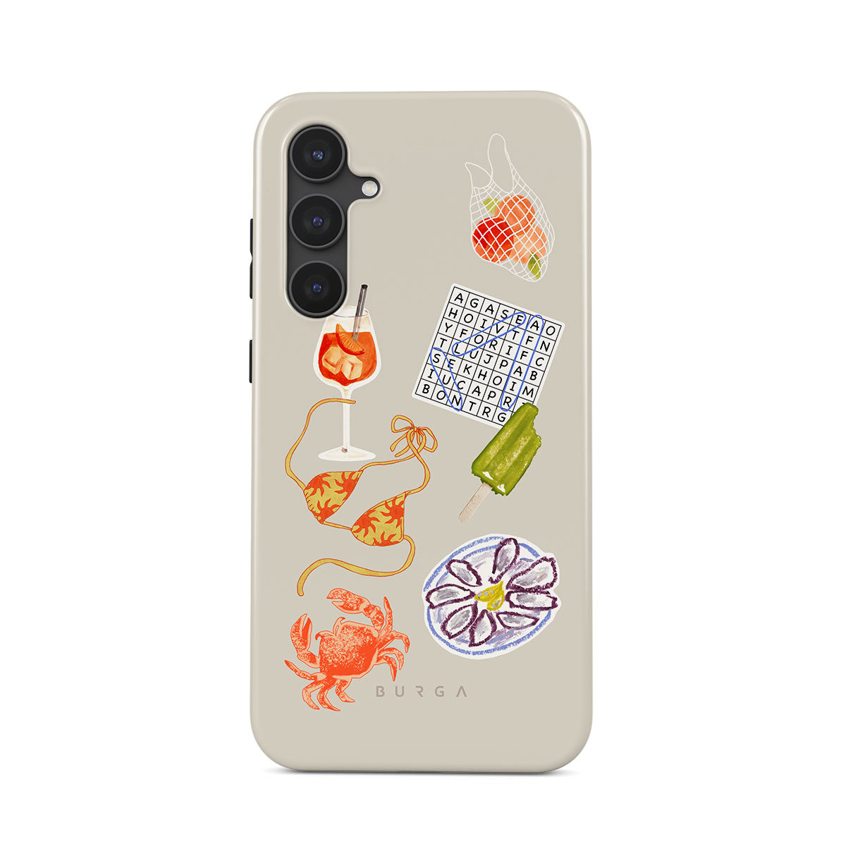 Den här stilen har: krabba, ostronfat, glass, korsord, spritz-cocktail, bikinitopp, frukt.