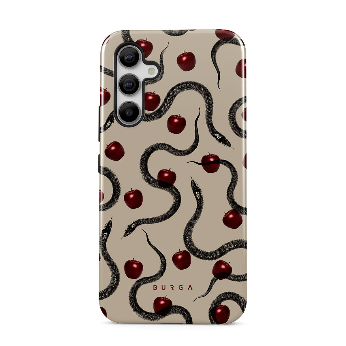 Den här designen innehåller: glansiga röda äpplen, slingrande ormar, beige toner.