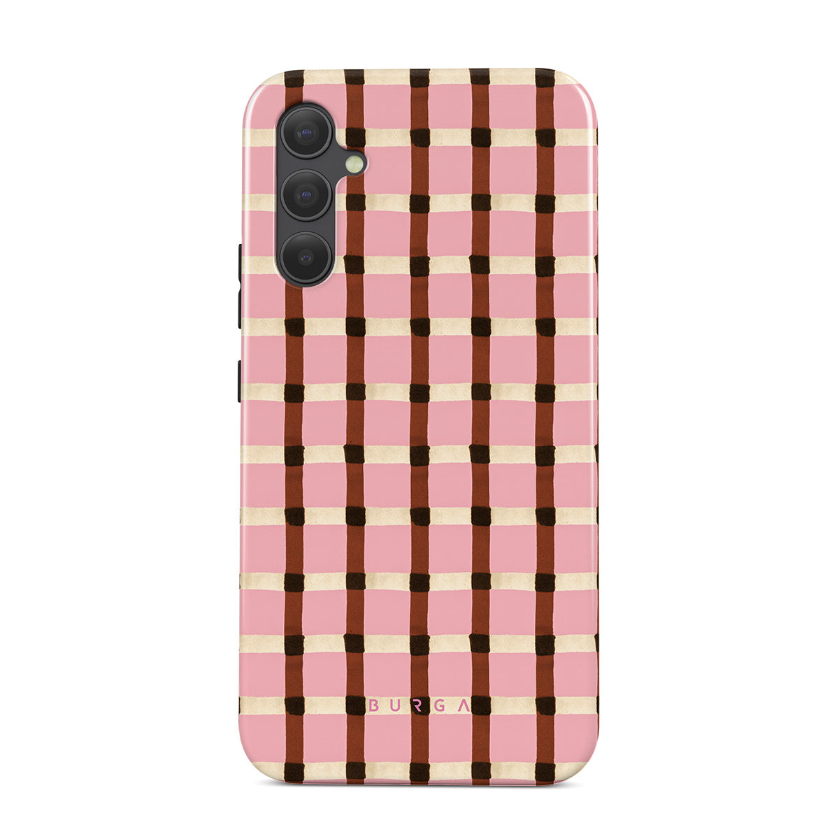 Denna design har: rosa och brunt rutmönster, gingham-mönster