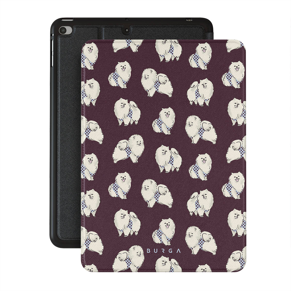 Den här stilen har: vita fluffiga hundar på en mörk vinröd bakgrund, pudlar, husdjur.