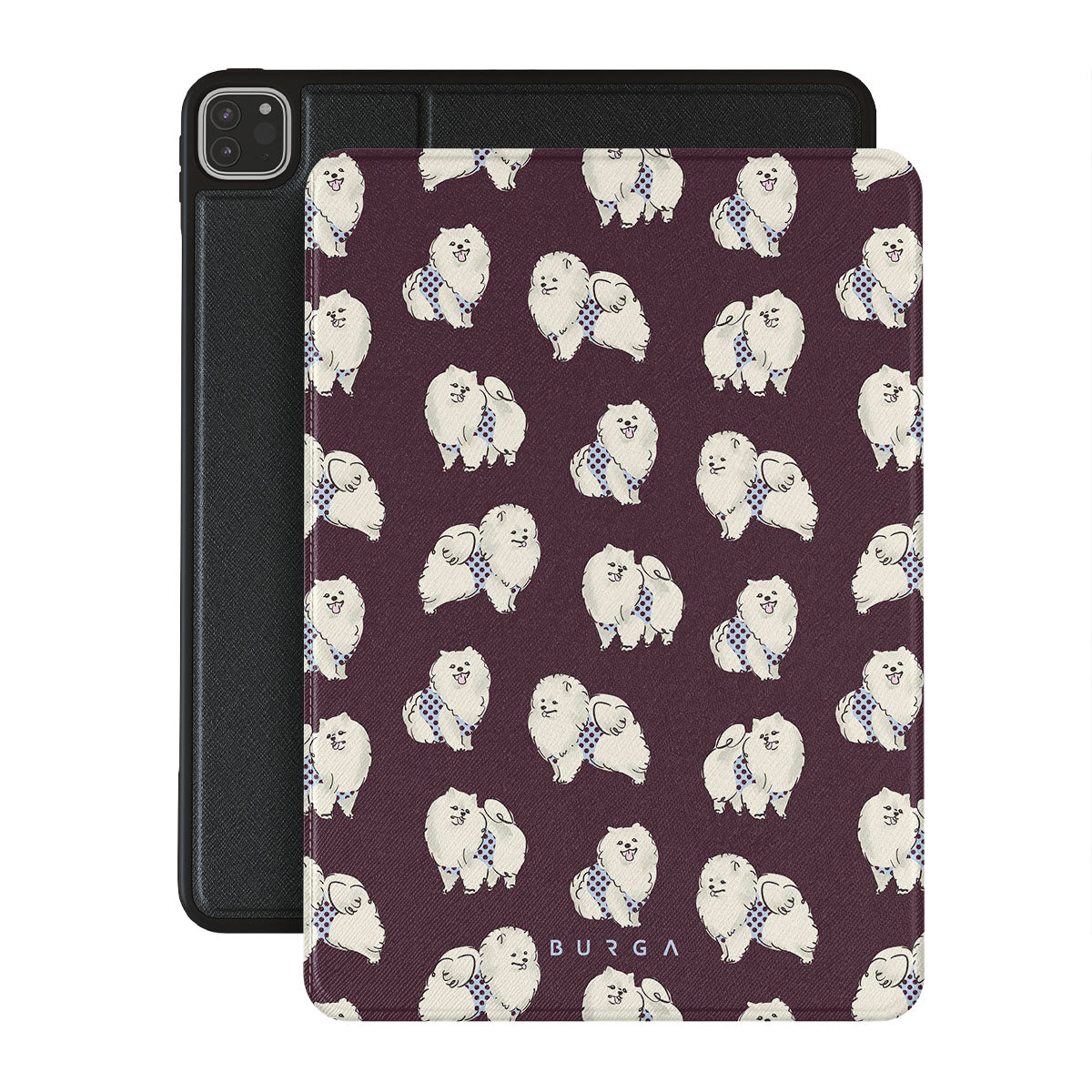 Den här stilen har: vita fluffiga hundar på en mörk vinröd bakgrund, pudlar, husdjur.