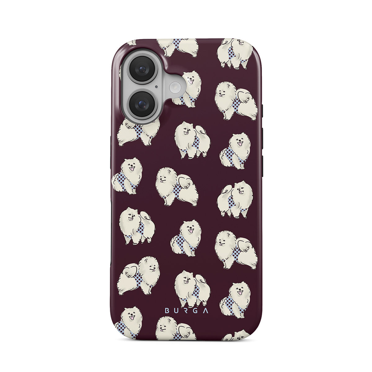 Den här stilen har: vita fluffiga hundar på en mörk vinröd bakgrund, pudlar, husdjur.