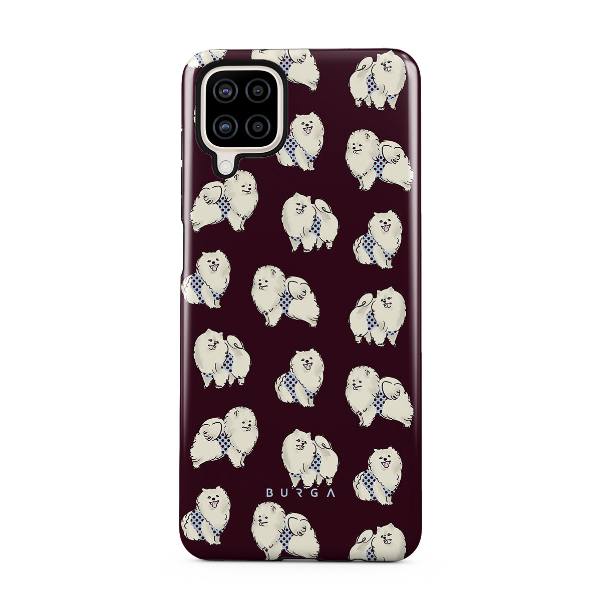 Den här stilen har: vita fluffiga hundar på en mörk vinröd bakgrund, pudlar, husdjur.