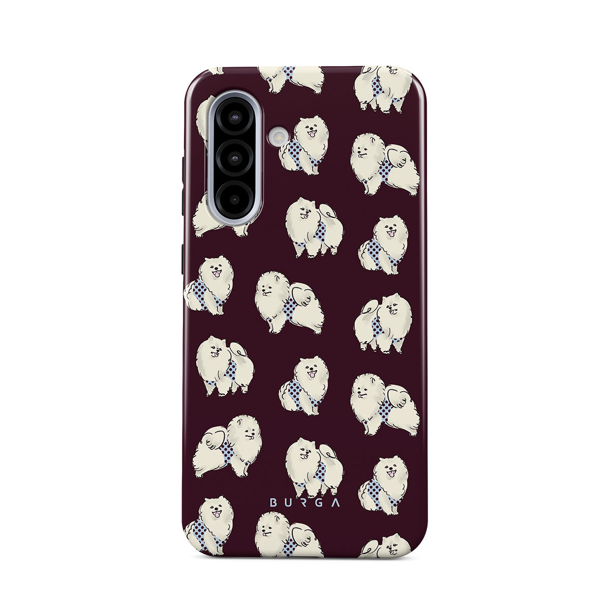 Den här stilen har: vita fluffiga hundar på en mörk vinröd bakgrund, pudlar, husdjur.