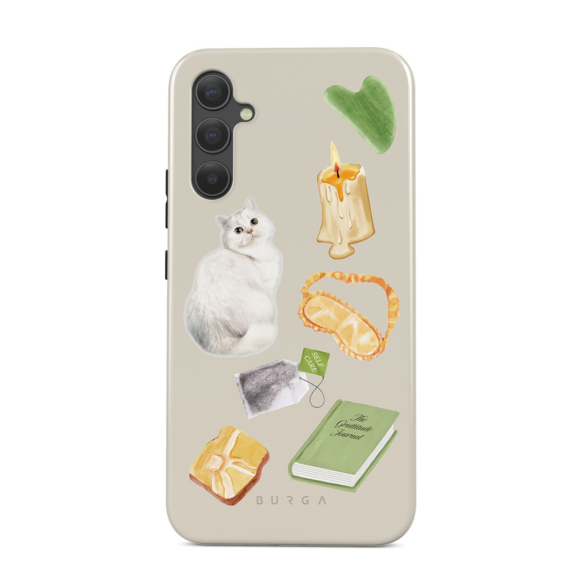Den här stilen har: vit katt, grön bok, ljus, Gua Sha-stav, sovmask, tepåse, gul kristall.