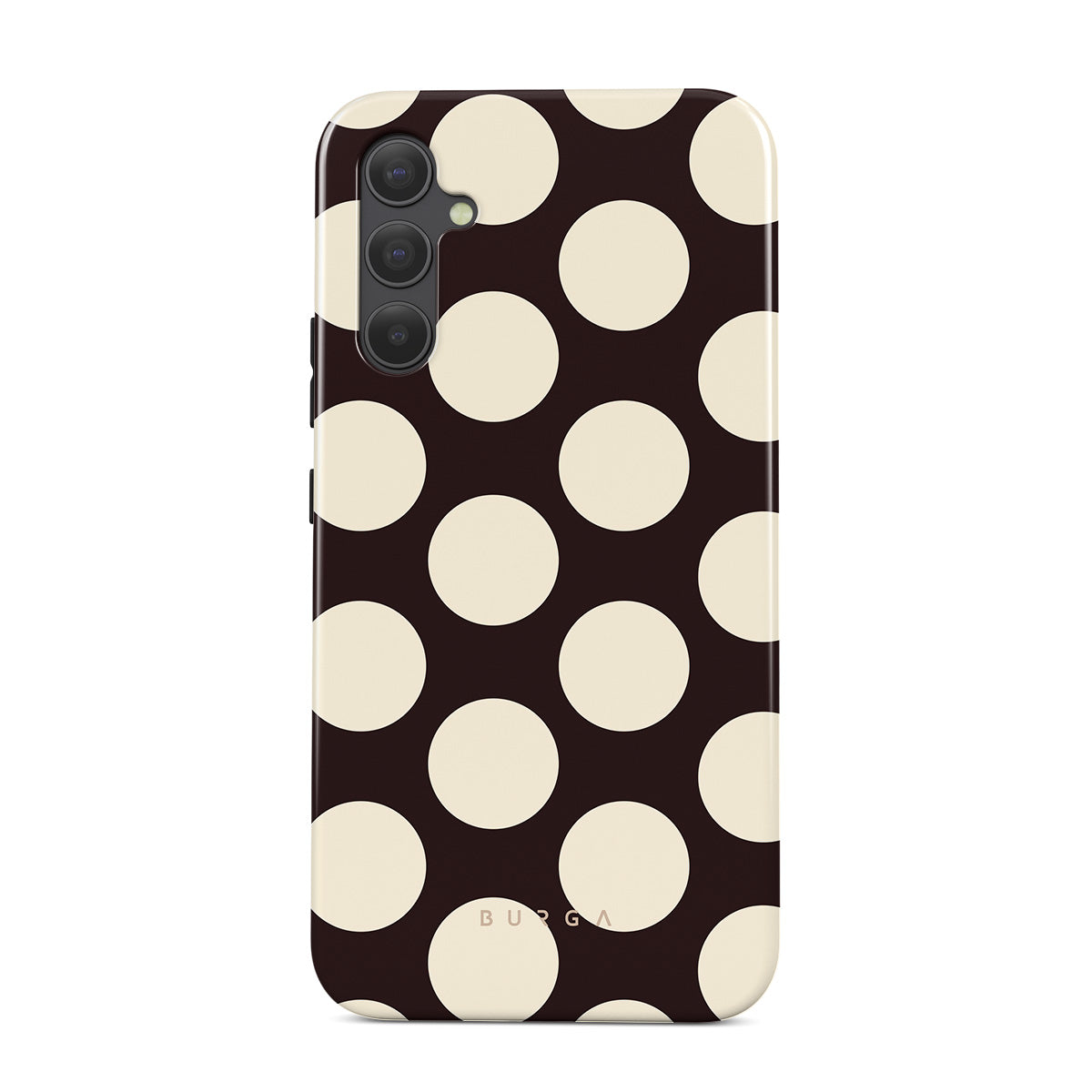 Den här stilen har: stora krämfärgade prickar på en mörk bakgrund.
