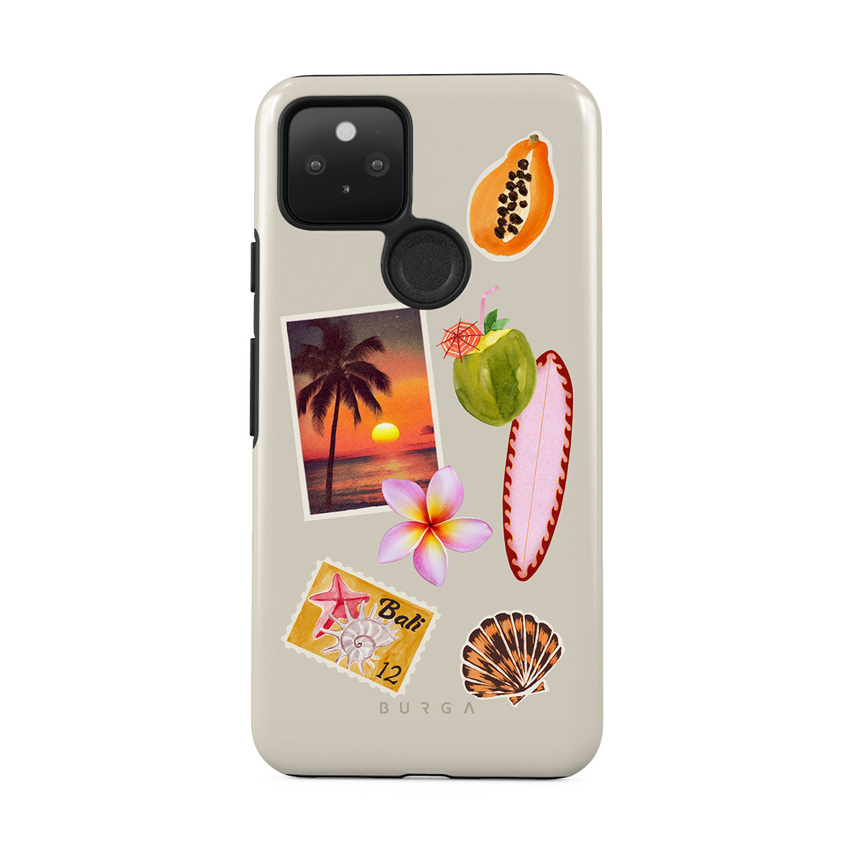Den här stilen har: tropiskt solnedgångsfoto, papaya, grön kokosnöt, rosa surfbräda, rosa plumeria-blomma, orange snäcka, Bali-vykort.