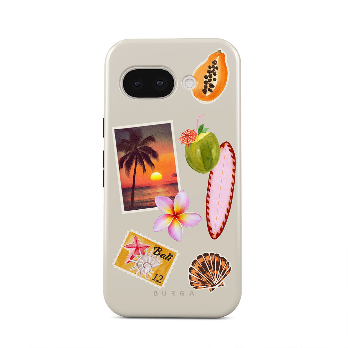 Den här stilen har: tropiskt solnedgångsfoto, papaya, grön kokosnöt, rosa surfbräda, rosa plumeria-blomma, orange snäcka, Bali-vykort.