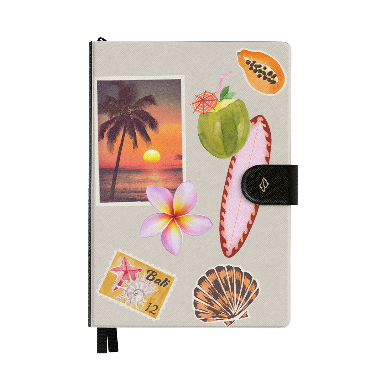 Den här stilen har: tropiskt solnedgångsfoto, papaya, grön kokosnöt, rosa surfbräda, rosa plumeria-blomma, orange snäcka, Bali-vykort.