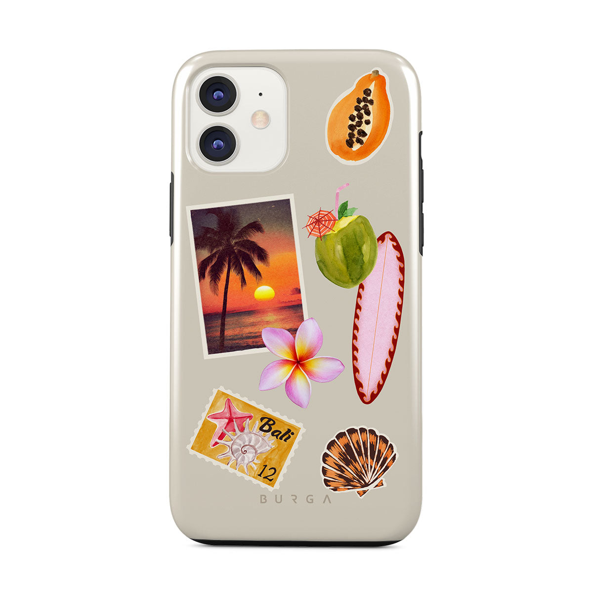 Den här stilen har: tropiskt solnedgångsfoto, papaya, grön kokosnöt, rosa surfbräda, rosa plumeria-blomma, orange snäcka, Bali-vykort.