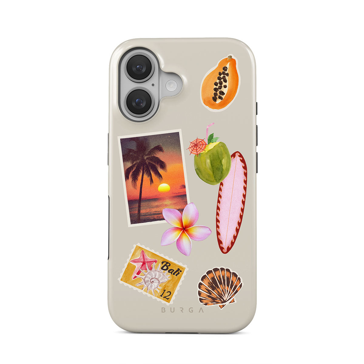 Den här stilen har: tropiskt solnedgångsfoto, papaya, grön kokosnöt, rosa surfbräda, rosa plumeria-blomma, orange snäcka, Bali-vykort.