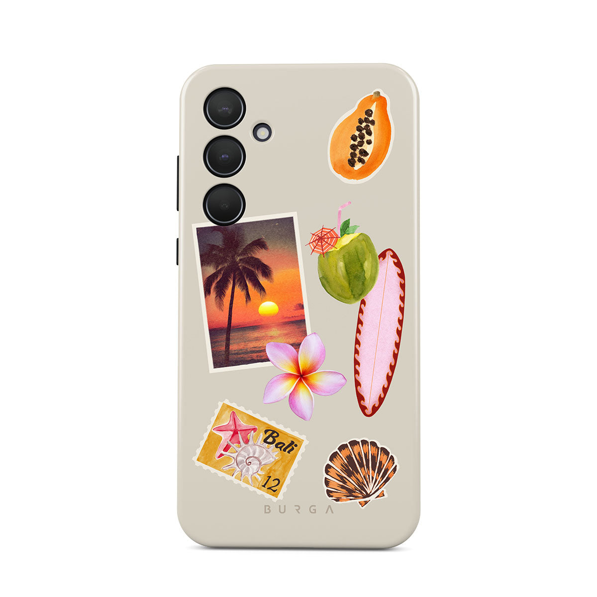 Den här stilen har: tropiskt solnedgångsfoto, papaya, grön kokosnöt, rosa surfbräda, rosa plumeria-blomma, orange snäcka, Bali-vykort.