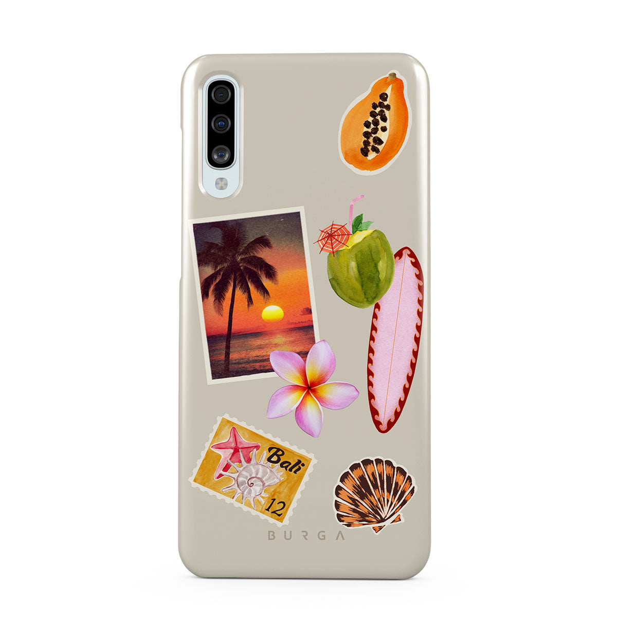 Den här stilen har: tropiskt solnedgångsfoto, papaya, grön kokosnöt, rosa surfbräda, rosa plumeria-blomma, orange snäcka, Bali-vykort.