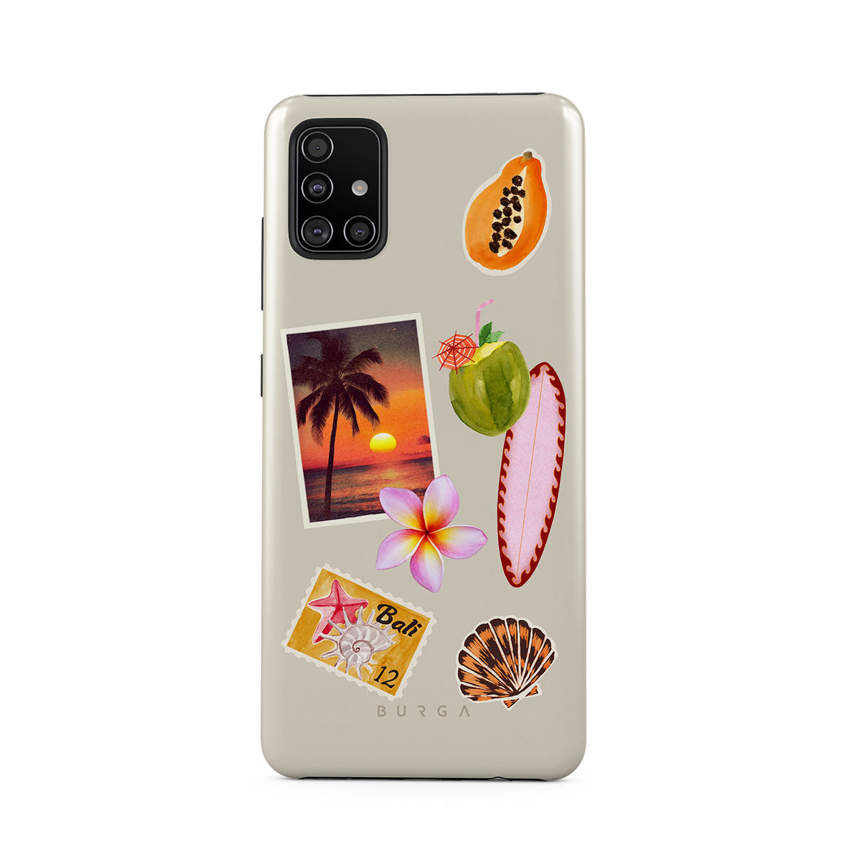 Den här stilen har: tropiskt solnedgångsfoto, papaya, grön kokosnöt, rosa surfbräda, rosa plumeria-blomma, orange snäcka, Bali-vykort.