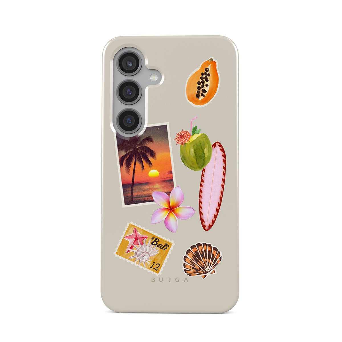 Den här stilen har: tropiskt solnedgångsfoto, papaya, grön kokosnöt, rosa surfbräda, rosa plumeria-blomma, orange snäcka, Bali-vykort.