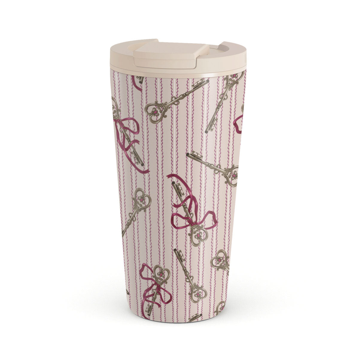 Den här stilen har: antika nycklar, rosetter, rosa band, randig bakgrund