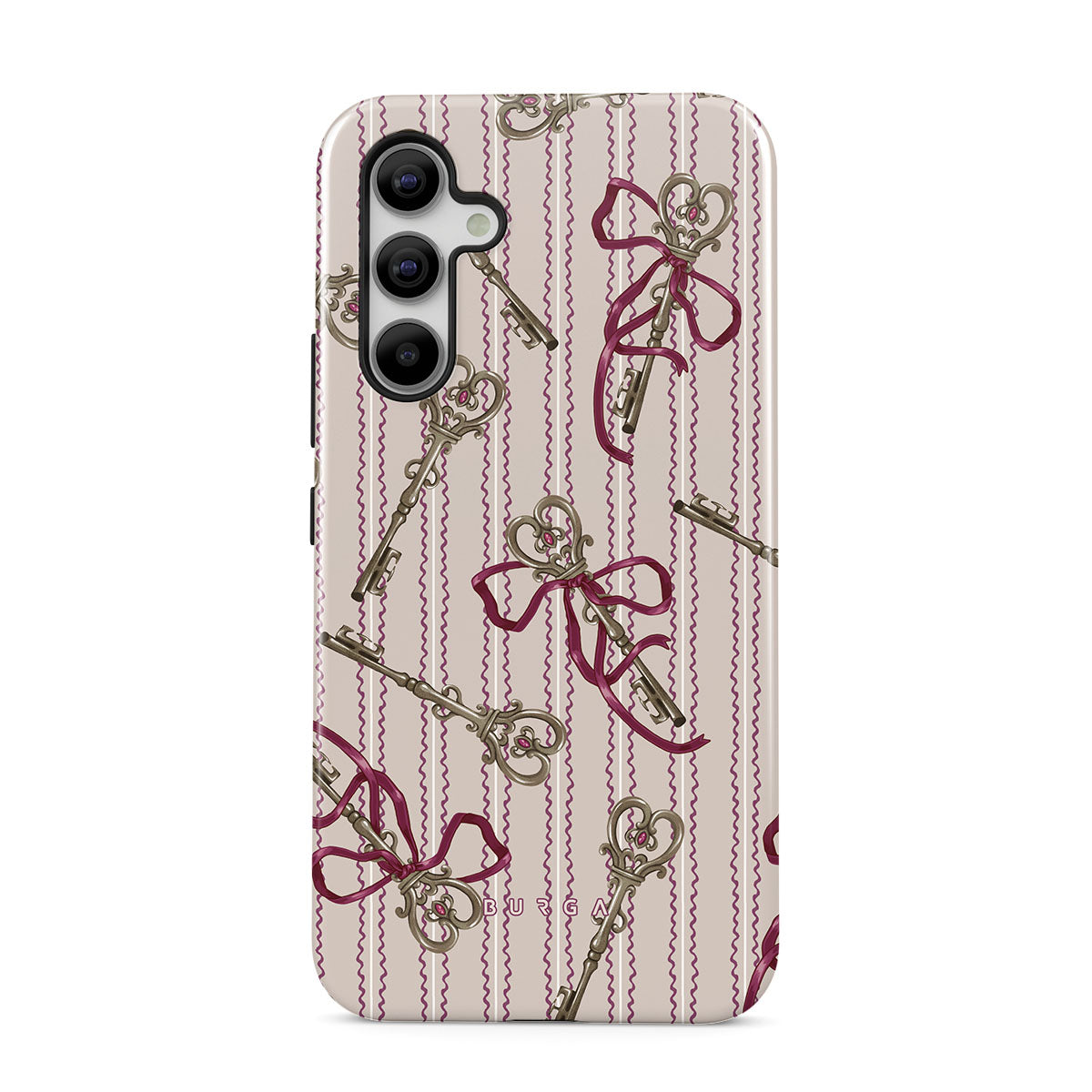 Den här stilen har: antika nycklar, rosetter, rosa band, randig bakgrund