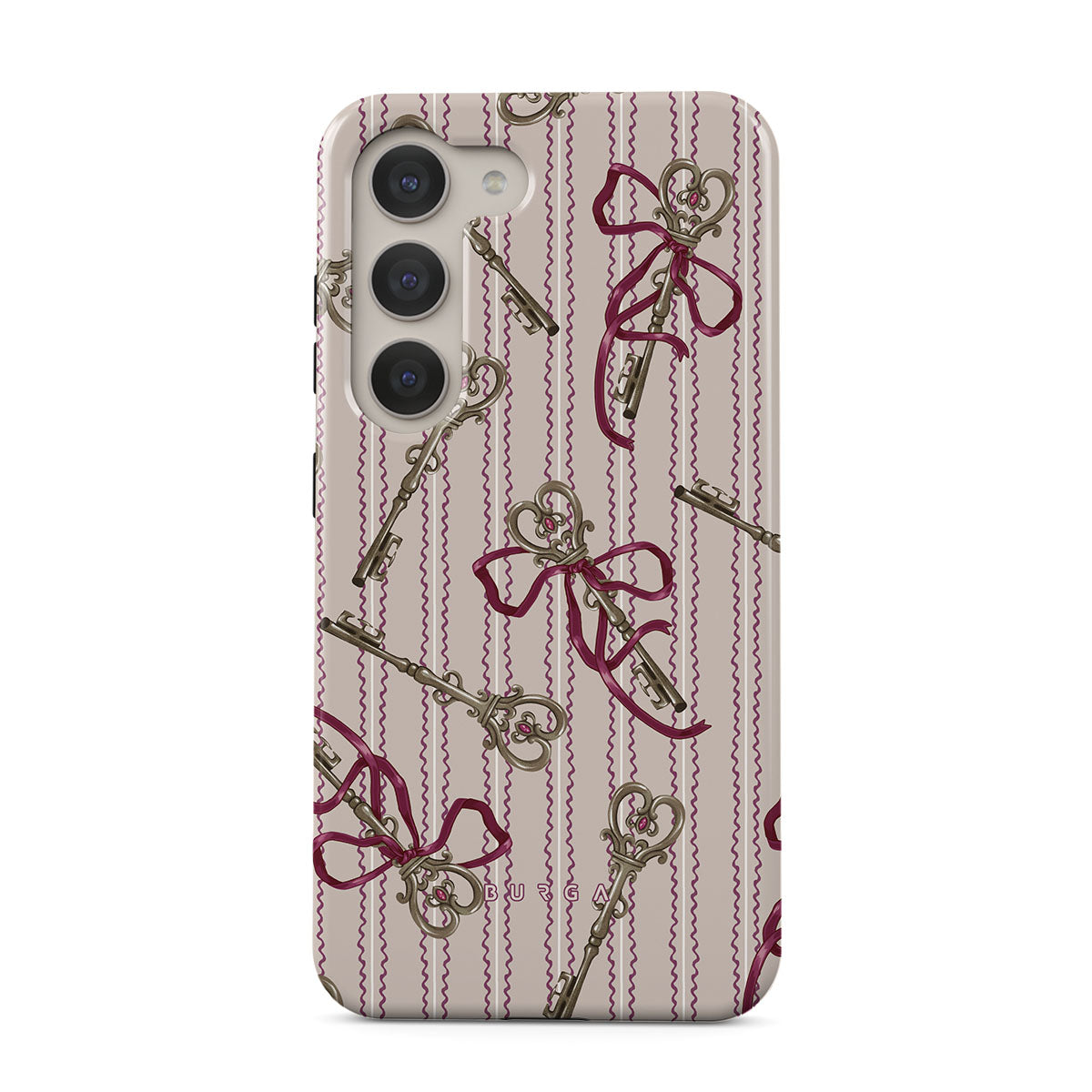 Den här stilen har: antika nycklar, rosetter, rosa band, randig bakgrund